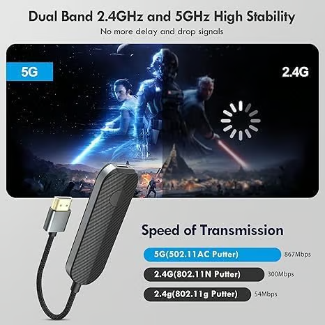 This wireless transmitter and receiver uses a 2.4G/5G dual-band transmission chip, providing a more stable and stronger signal, offering a 165-foot lag-free transmission distance. The signal can penetrate walls or ceilings, providing you with an unobstructed and smooth video experience.